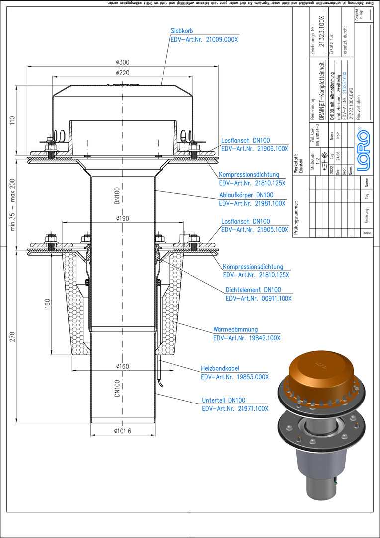 LORO DRAINJET Komplett-Schnellablauf Serie 49 DN 100, Wärmedämmung und Heizung, Klemmflansch, Auslauf senkrecht, zweiteilig, Notablauf