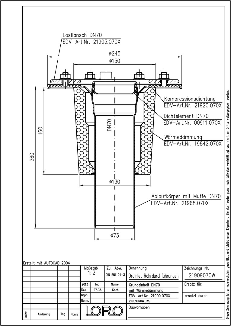 LORO DRAINLET Grundeinheit DN 70, Wärmedämmung, Klemmflansch, Auslauf senkrecht, für Verkehrsflächen