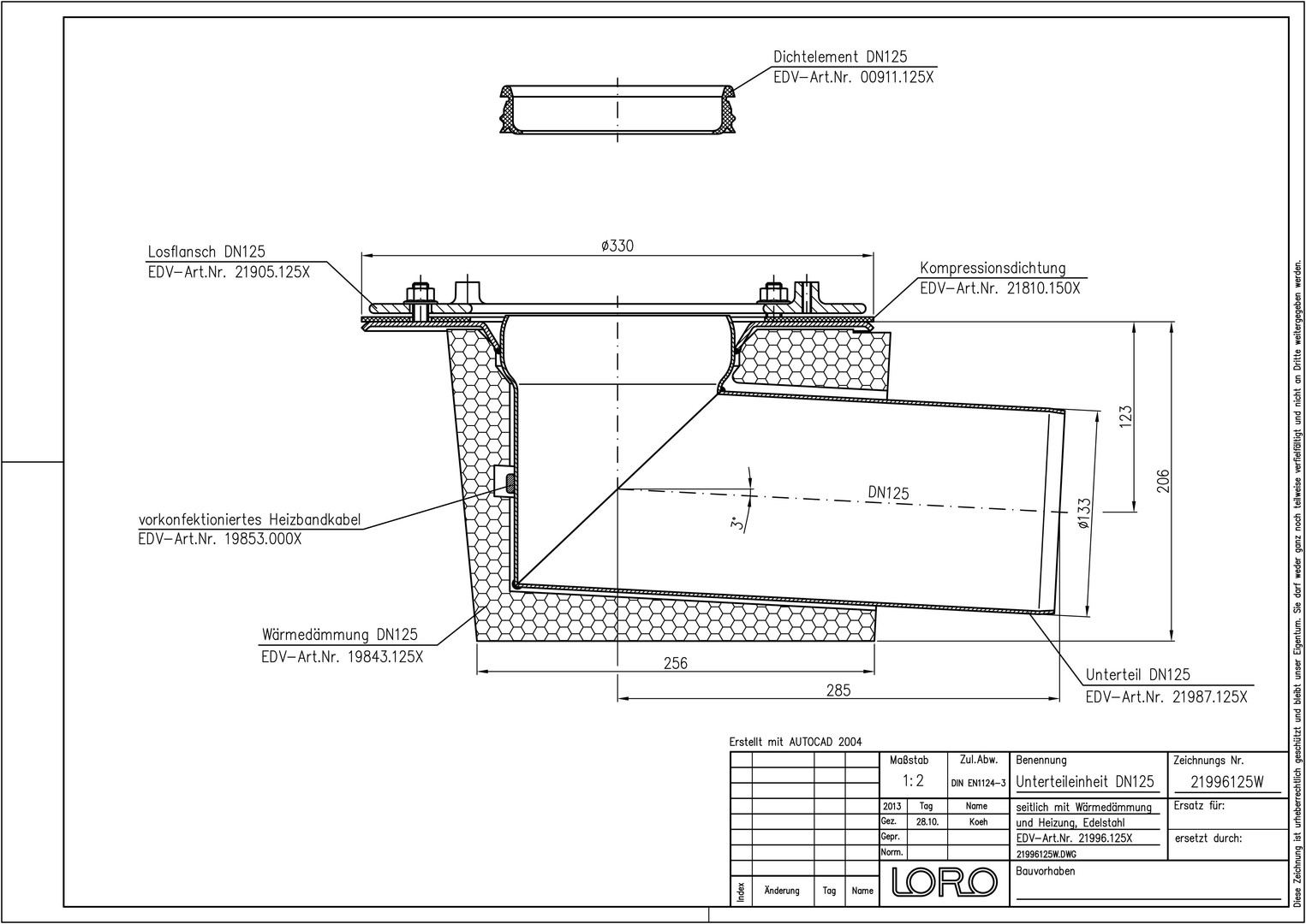 LORO DRAINLET Grundeinheit Serie 84 DN 125, mit Wärmedämmung und Heizung, Klemmflansch, Auslauf seitlich 3Grad