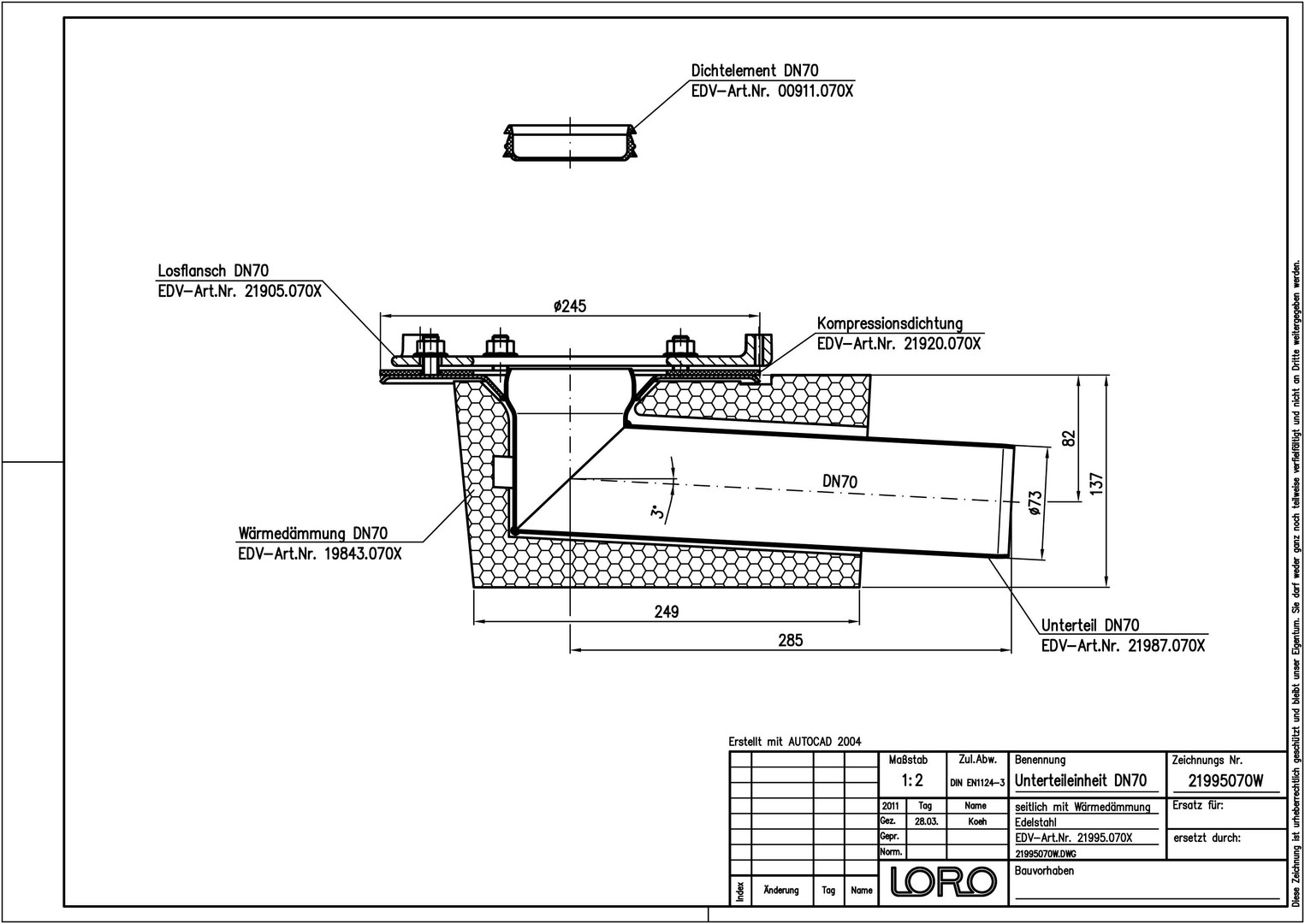 LORO DRAINLET Grundeinheit Serie 84 DN 70, mit Wärmedämmung, Klemmflansch, Auslauf seitlich 3Grad