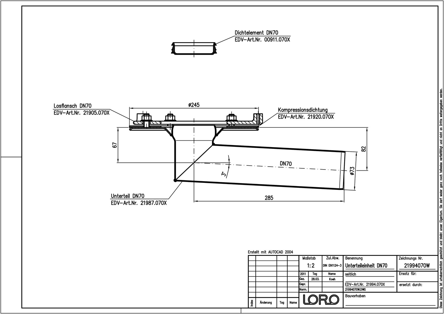 LORO DRAINLET Grundeinheit Serie 84 DN 70, ohne Wärmedämmung, Klemmflansch, Auslauf seitlich 3Grad W559240
