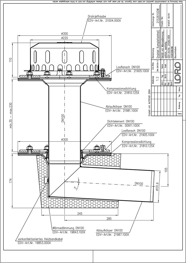 LORO DRAINLET Komplett-Flachdachablauf Serie 84 DN 100, Wärmedämmung und Heizung, Klemmflansch, Auslauf seitlich 3Grad, zweiteilig, Hauptentwässerung