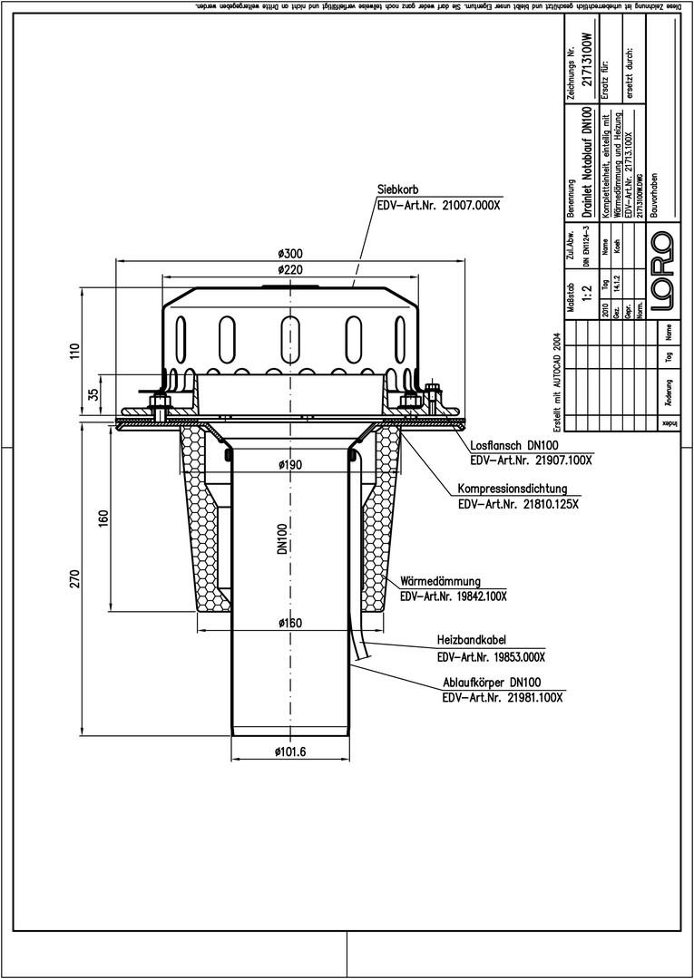 LORO DRAINLET Komplett-Flachdachablauf Serie 84 DN 100, Wärmedämmung und Heizung, Klemmflansch, Auslauf senkrecht, einteilig, Notablauf