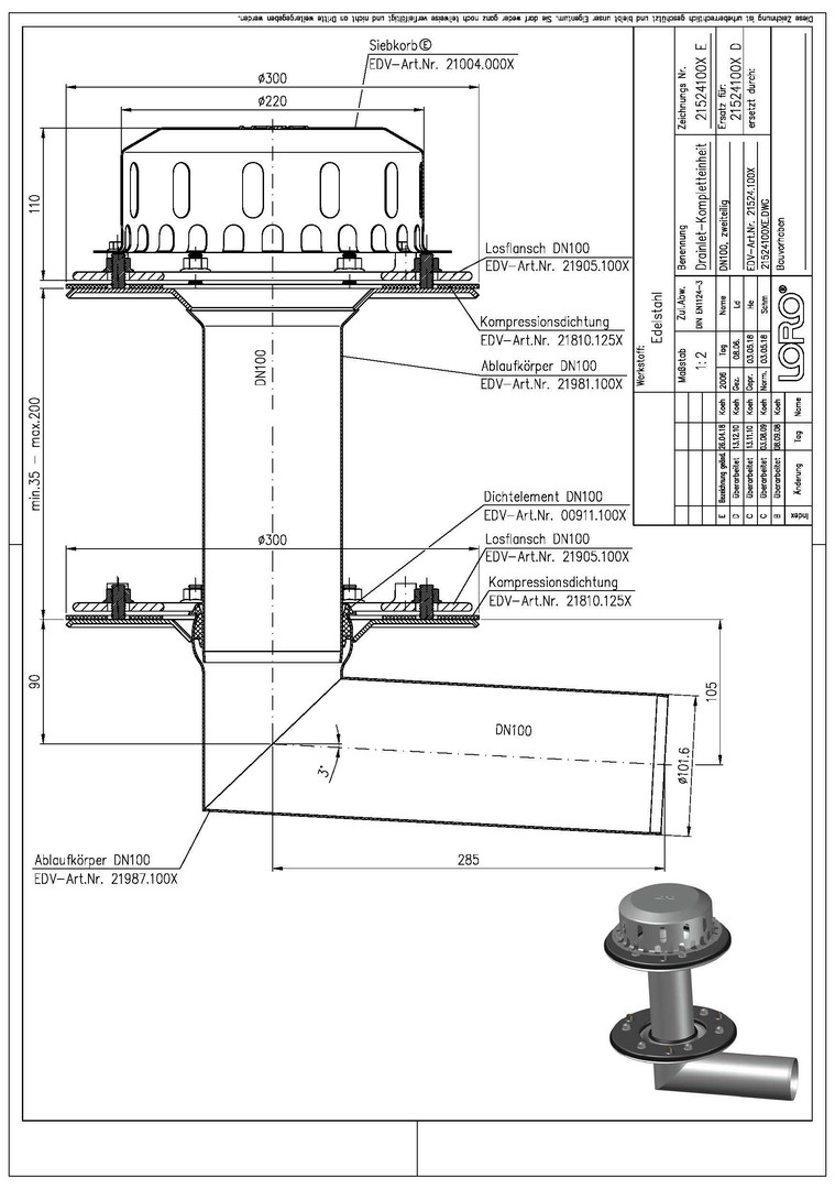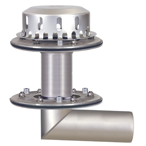 LORO DRAINLET Komplett-Flachdachablauf Serie 84 DN 100, ohne Wärmedämmung, Klemmflansch, Auslauf seitlich 3Grad, zweiteilig, Hauptentwässerung