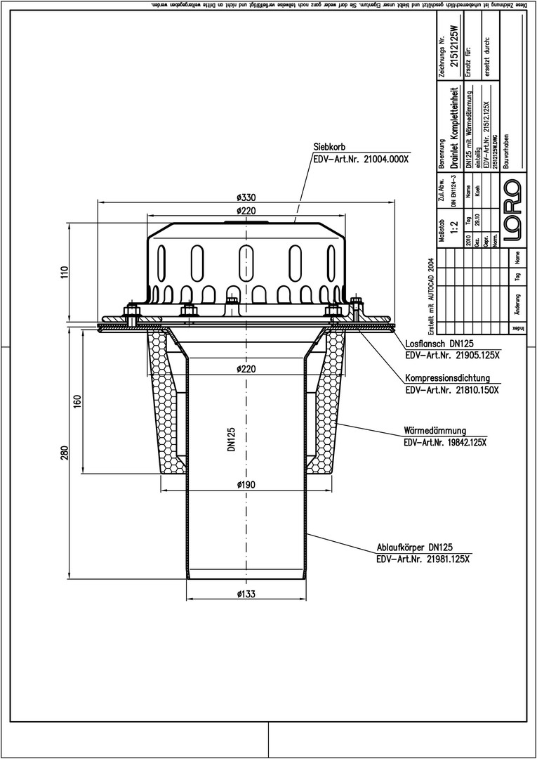 LORO DRAINLET Komplett-Flachdachablauf Serie 84 DN 125, Wärmedämmung, Klemmflansch, Auslauf senkrecht, einteilig, Hauptentwässerung