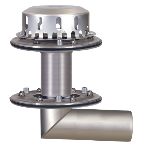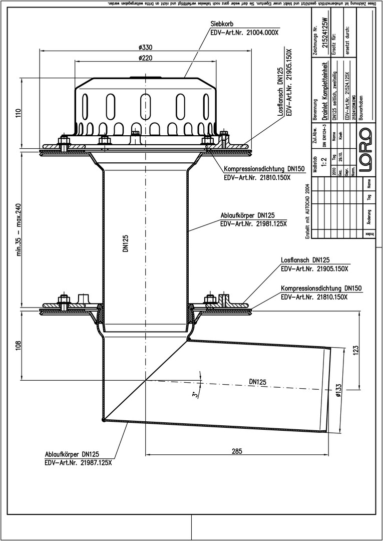 LORO DRAINLET Komplett-Flachdachablauf Serie 84 DN 125, ohne Wärmedämmung, Klemmflansch, Auslauf seitlich 3Grad, zweiteilig, Hauptentwässerung