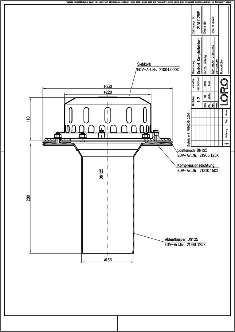 LORO DRAINLET Komplett-Flachdachablauf Serie 84 DN 125, ohne Wärmedämmung, Klemmflansch, Auslauf senkrecht, einteilig, Hauptentwässerung