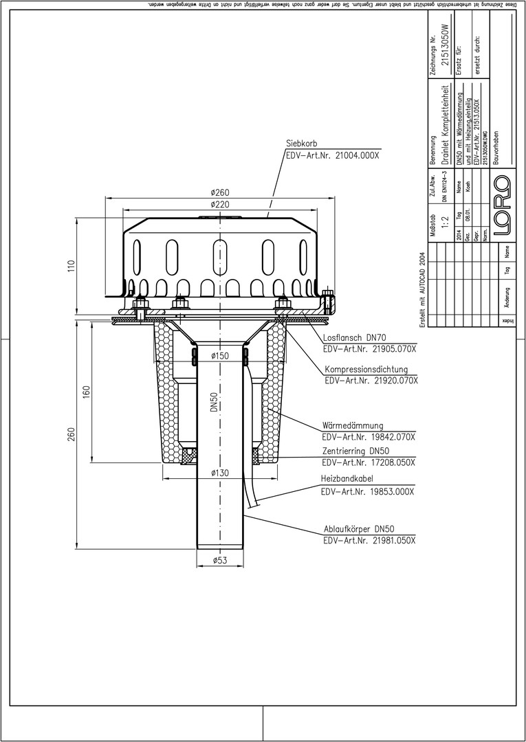 LORO DRAINLET Komplett-Flachdachablauf Serie 84 DN 50, Wärmedämmung und Heizung, Klemmflansch, Auslauf senkrecht, einteilig, Hauptentwässerung