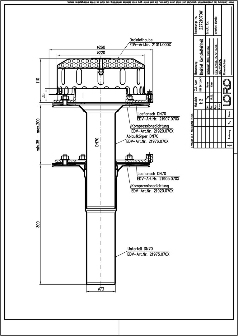 LORO DRAINLET Komplett-Flachdachablauf Serie 84 DN 70, Brandschutz bauseitig, Klemmflansch, zweiteilig, Notablauf