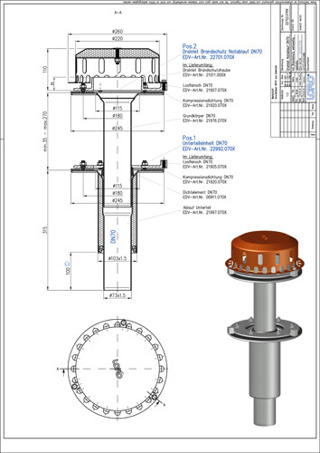LORO DRAINLET Komplett-Flachdachablauf Serie 84 DN 70, Brandschutz werkseitig, Klemmflansch, zweiteilig, Notablauf