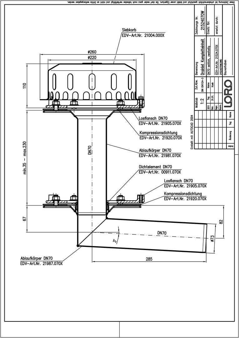 LORO DRAINLET Komplett-Flachdachablauf Serie 84 DN 70, ohne Wärmedämmung, Klemmflansch, Auslauf seitlich 3Grad, zweiteilig, Hauptentwässerung