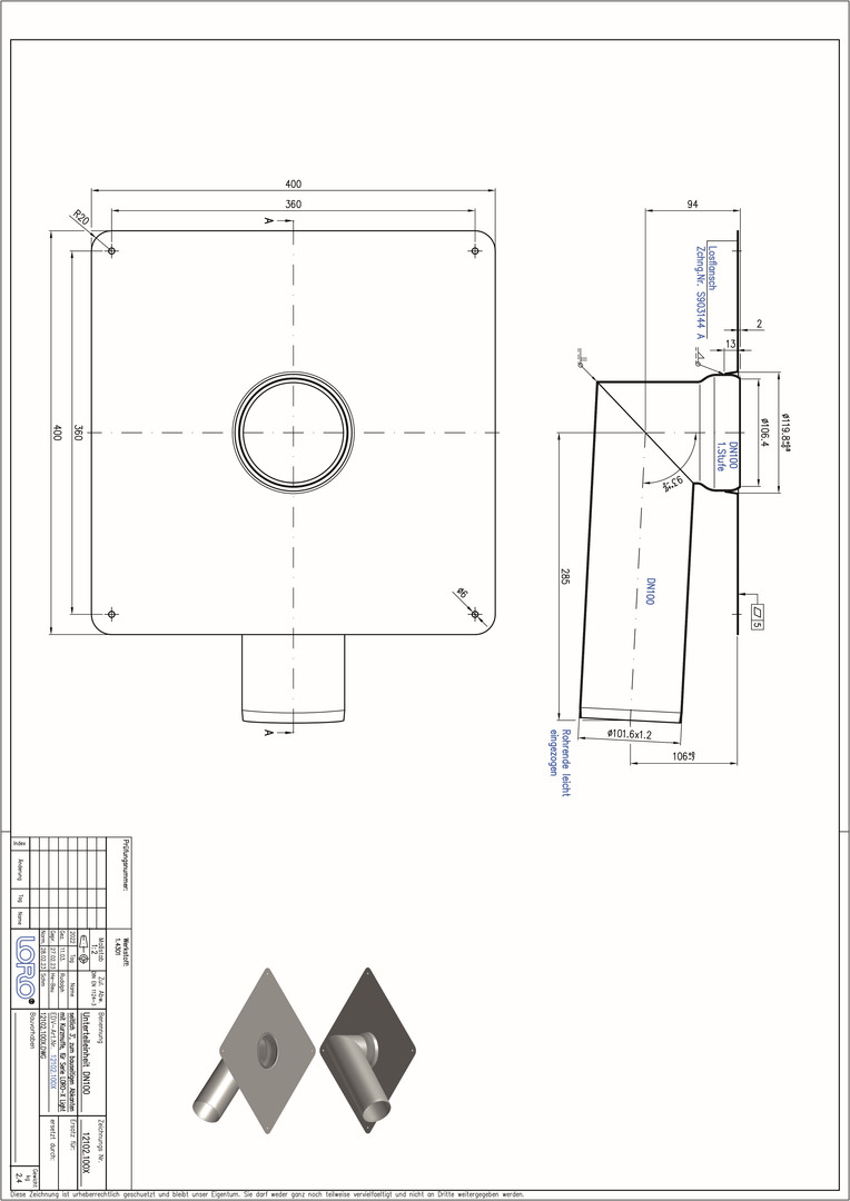 LORO Flachdachablauf Untereinheit X-Light ohne Wärmedämmung, Edelstahl, Auslauf seitlich 3°, DN 100