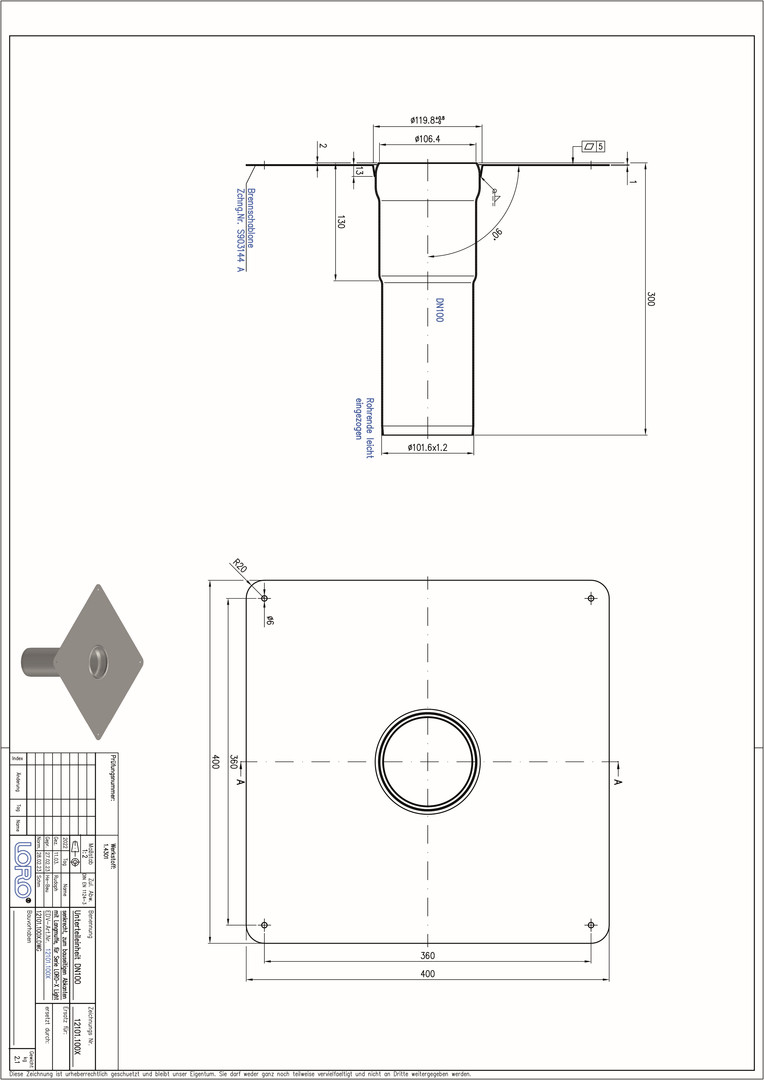 LORO Flachdachablauf Untereinheit X-Light ohne Wärmedämmung, Edelstahl, Auslauf seitlich 3°, DN 100 W558601