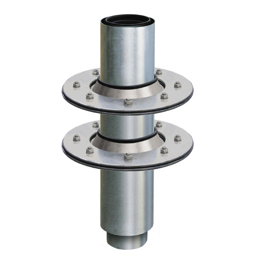 bestehend aus Durchführungsrohr wärmegedämmt (Innenrohr aus Stahl, feuerverzinkt mit zusätzlicher Innenbeschichtung, Außenrohr aus Edelstahl, Baustoffklasse A1, Wärmedämmung aus PU-Hartschaum ist selbstverlöschend nach ASTM 1692-74T) und zwei Schiebeflansche mit Dichtelementen