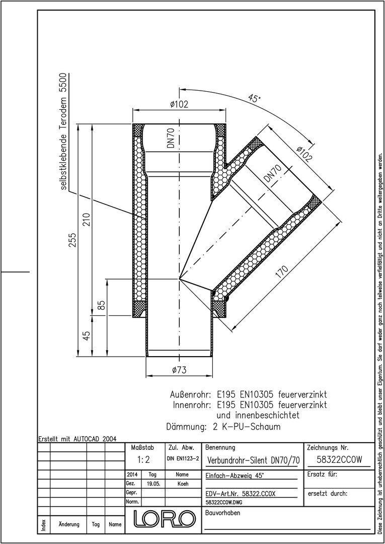 LORO Verbundrohr-Abzweig SILENT DN 70, 45°