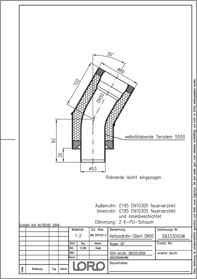 für erhöhte Schallschutzanforderungen, doppelwandiges Abflussrohr, bestehend aus: Innenrohr mit Schallschutzfolie, PU-Dämmschicht, Baustoffklasse B2, Außenrohr (Innenrohr- und Außenrohr aus LORO-X Stahlabflussrohr