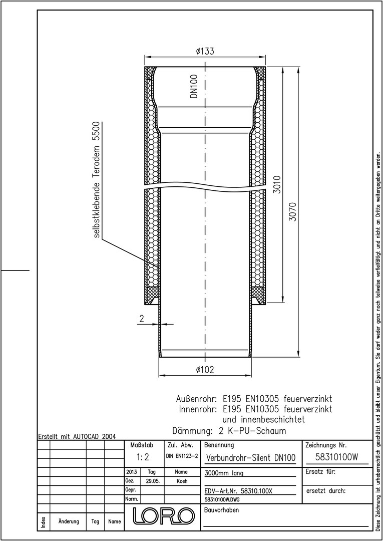 für erhöhte Schallschutzanforderungen, doppelwandiges Abflussrohr, bestehend aus: Innenrohr mit Schallschutzfolie, PU-Dämmschicht, Baustoffklasse B2, Außenrohr (Innenrohr- und Außenrohr aus LORO-X Stahlabflussrohr