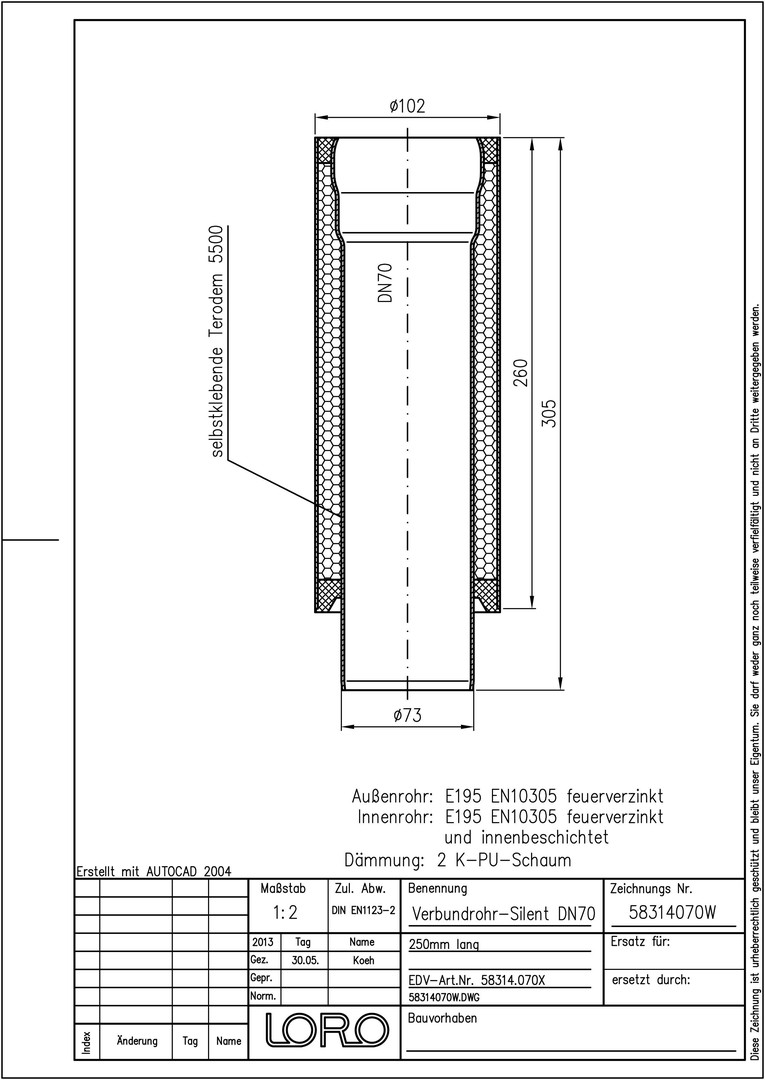 für erhöhte Schallschutzanforderungen, doppelwandiges Abflussrohr, bestehend aus: Innenrohr mit Schallschutzfolie, PU-Dämmschicht, Baustoffklasse B2, Außenrohr (Innenrohr- und Außenrohr aus LORO-X Stahlabflussrohr