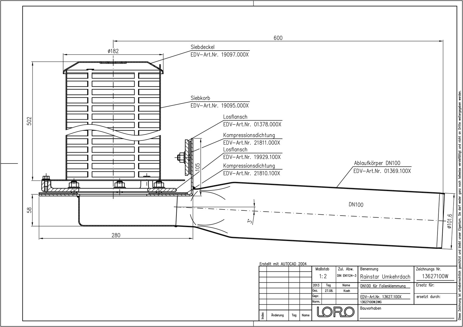 LORO X Ablauf Serie 89 495 mm Aufbauhöhe, DN 100, Umkehrdach und Kunststoff-Dachabdichtungsbahnen, Hauptentwässerung