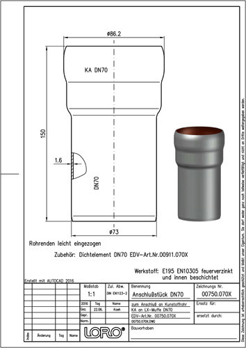 LORO X Anschlussstück DN 70/70, von KA-Rohr an Muffe