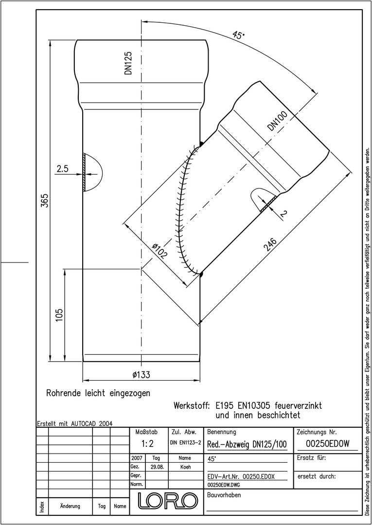 LORO X Reduzier-Abzweig DN 125/100, 45Grad