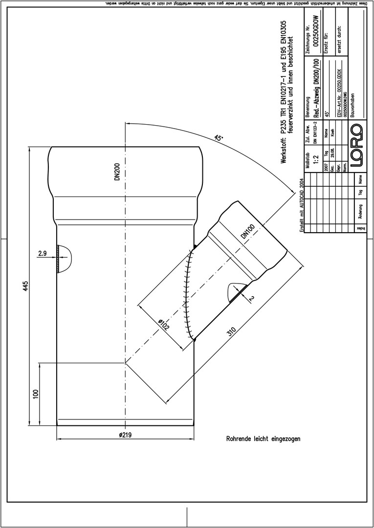 LORO X Reduzier-Abzweig DN 200/100, 45Grad