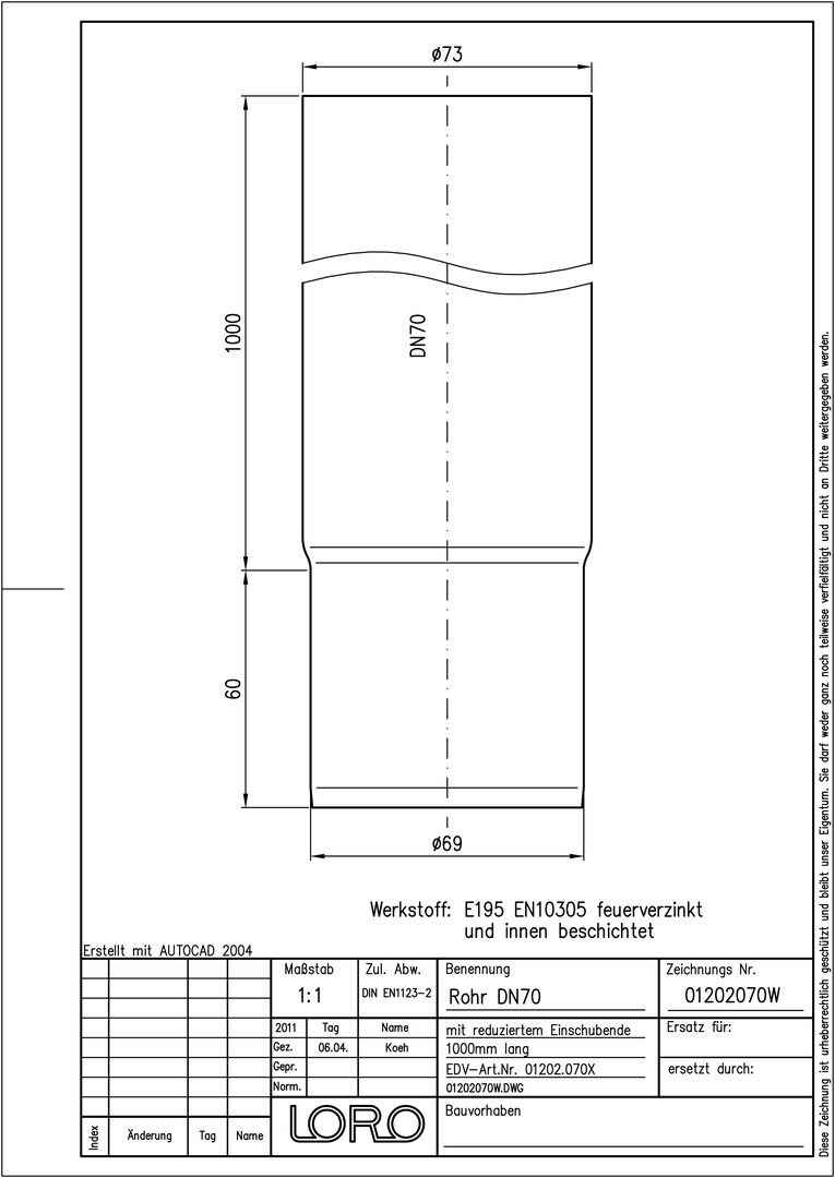 LORO X Regenfallrohr DN 70, 2000 mm, mit reduziertem Einschubende, Stahl W553831