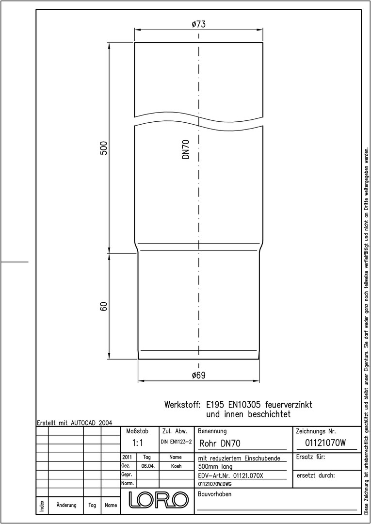 LORO X Regenfallrohr DN 70, 500 mm, mit reduziertem Einschubende, Stahl W553840