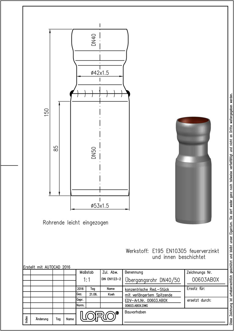 LORO X Übergangsrohr DN 40/50, konzentrische Reduzierstücke