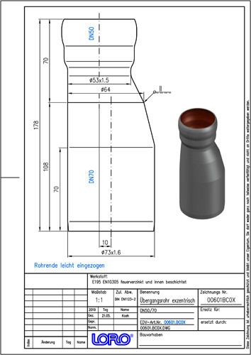 LORO X Übergangsrohr DN 50/70, exzentrische Reduzierstücke, Form 1