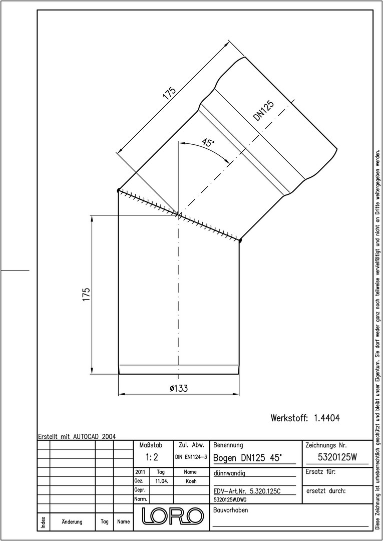 LORO XCL Bogen DN 125, 45°, Werkstoff 1.4404