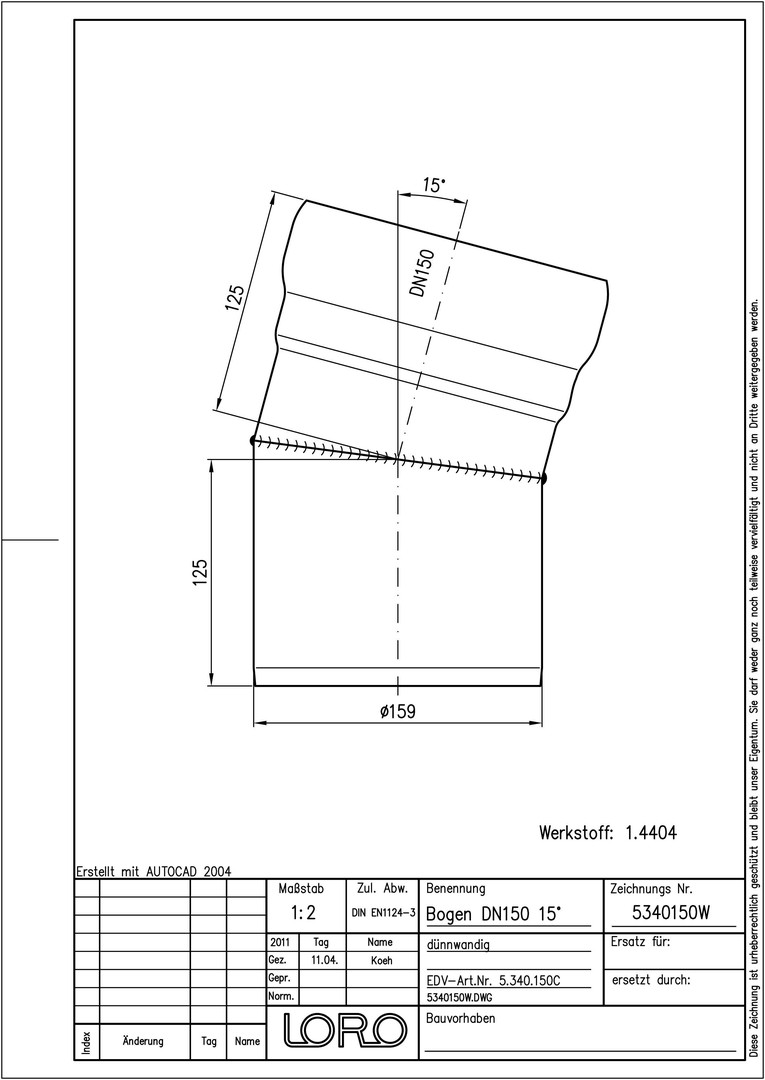 LORO XCL Bogen DN 150, 15°, Werkstoff 1.4404