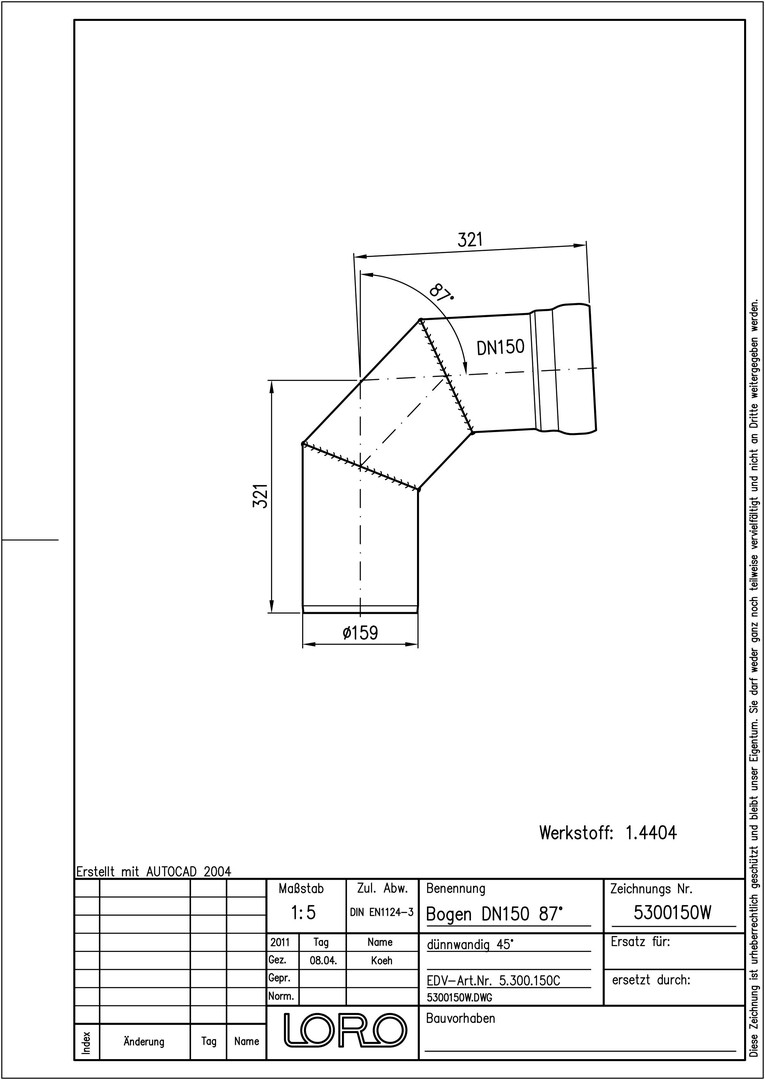 LORO XCL Bogen DN 150, 87°, Werkstoff 1.4404