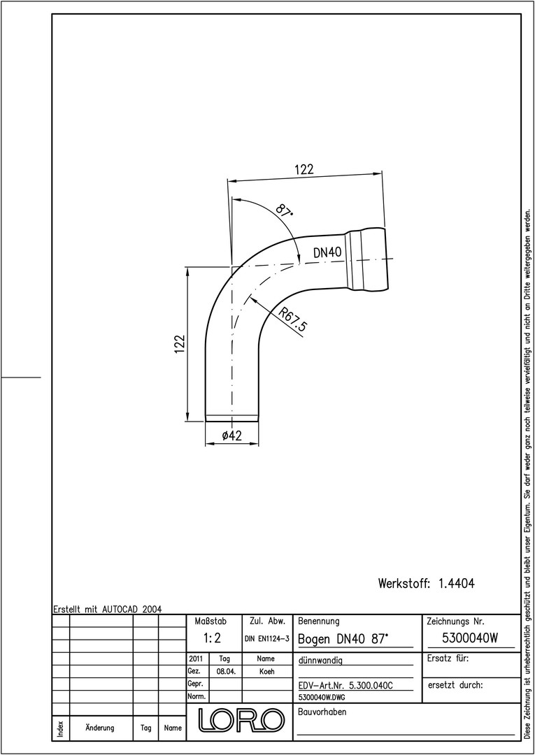LORO XCL Bogen DN 40, 87°, Werkstoff 1.4404