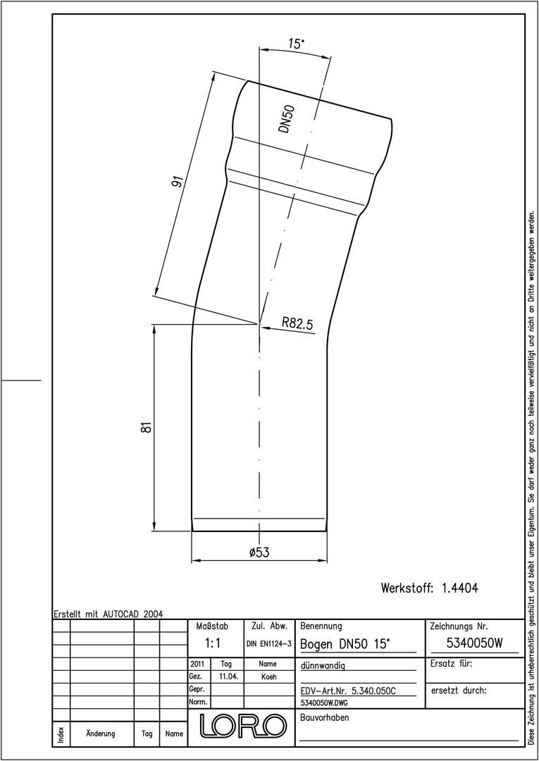 LORO XCL Bogen DN 50, 15°, Werkstoff 1.4404