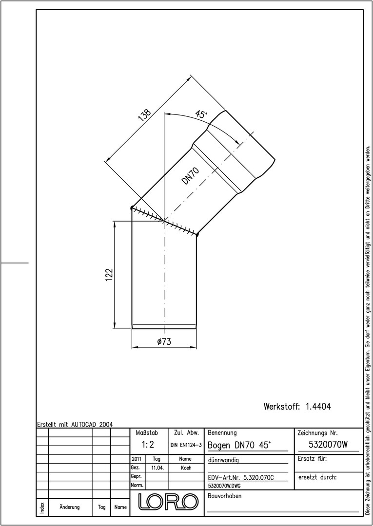 LORO XCL Bogen DN 70, 45°, Werkstoff 1.4404