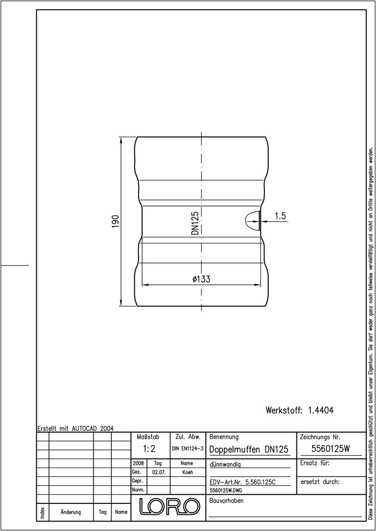 LORO XCL Doppelmuffe DN 125, Werkstoff 1.4404