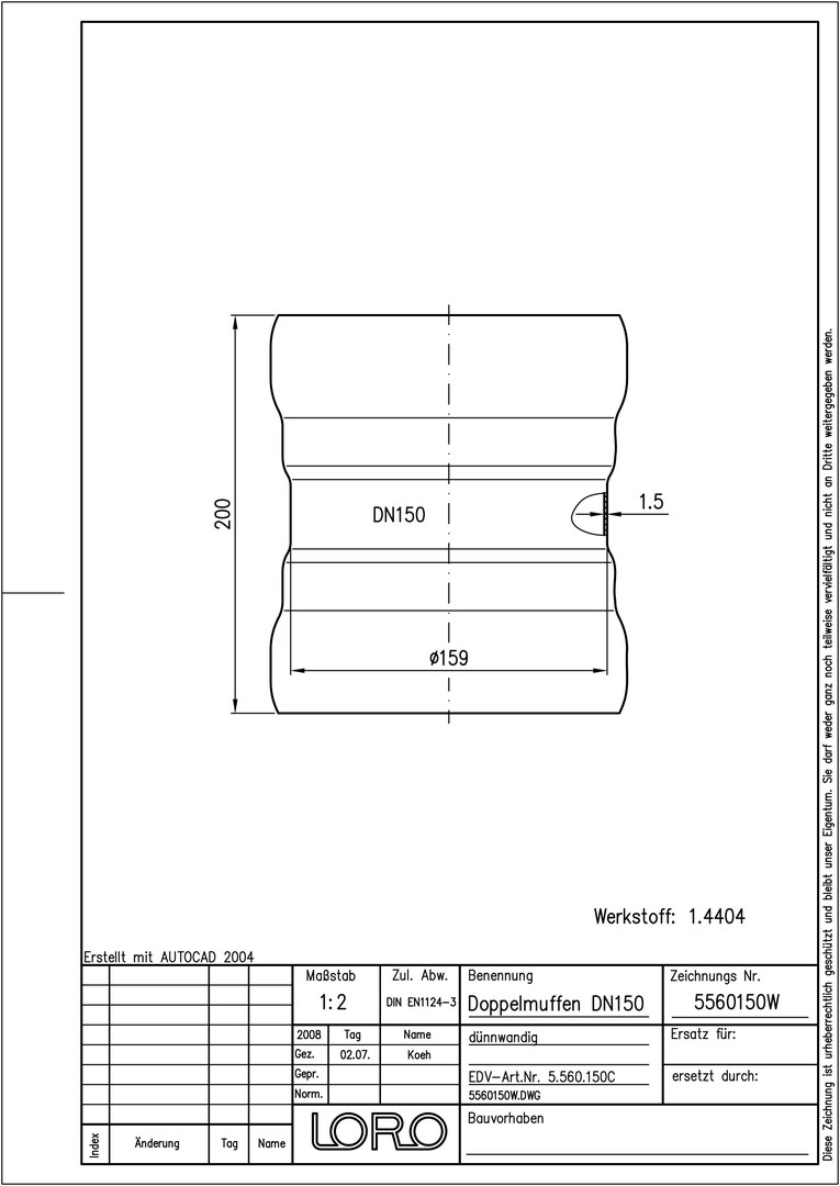 LORO XCL Doppelmuffe DN 150, Werkstoff 1.4404