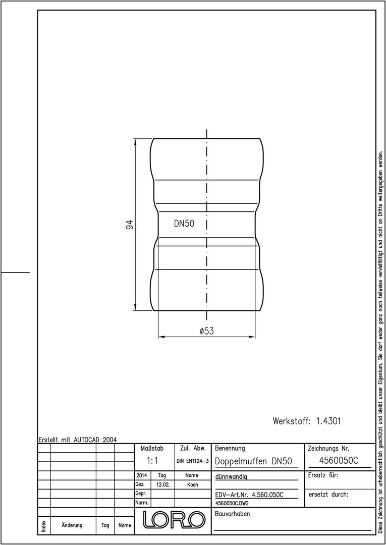 LORO XCL Doppelmuffe DN 50, Werkstoff 1.4301
