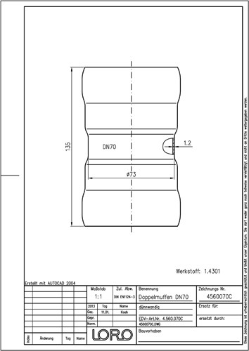 LORO XCL Doppelmuffe DN 70, Werkstoff 1.4301
