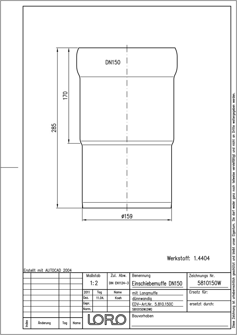 LORO XCL Einschiebmuffe DN 150, mit Langmuffe, Werkstoff 1.4404