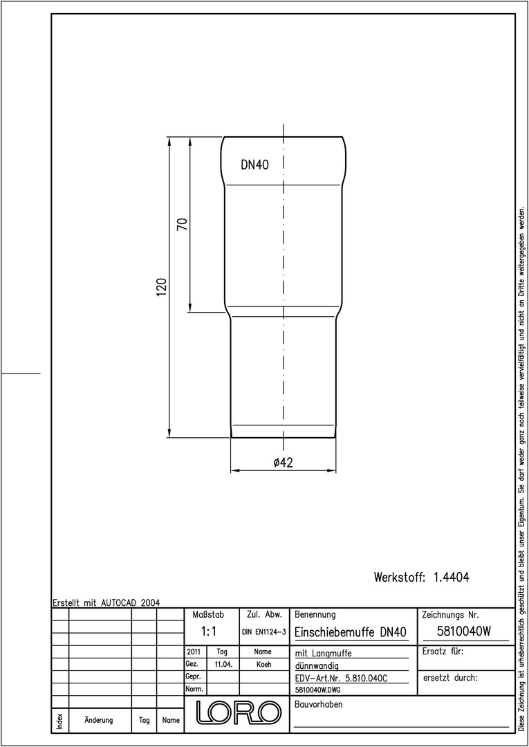 LORO XCL Einschiebmuffe DN 40, mit Langmuffe, Werkstoff 1.4404