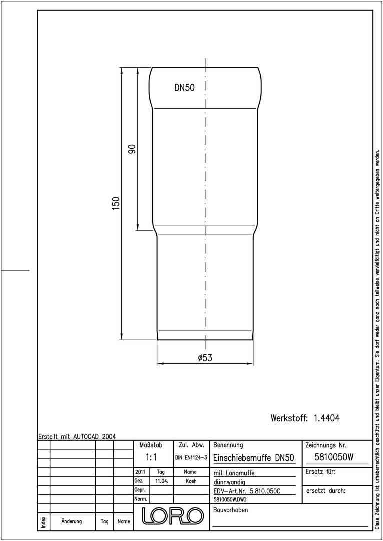 LORO XCL Einschiebmuffe DN 50, mit Langmuffe, Werkstoff 1.4404