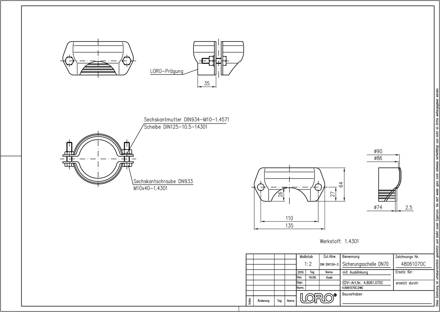 LORO XCL Sicherungsschelle DN 70, mit Ausklinkung für Verbindung Rohr/Abzweig, Werkstoff 1.4301