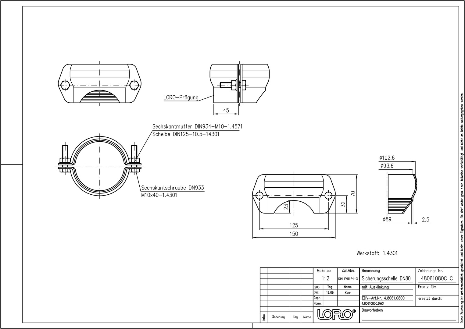 LORO XCL Sicherungsschelle DN 80, mit Ausklinkung für Verbindung Rohr/Abzweig, Werkstoff 1.4301