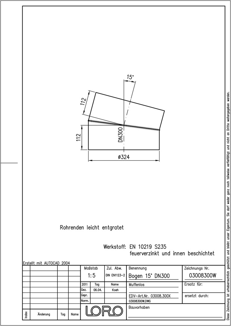 LORO XML Bogen 15°, DN 300, muffenlos