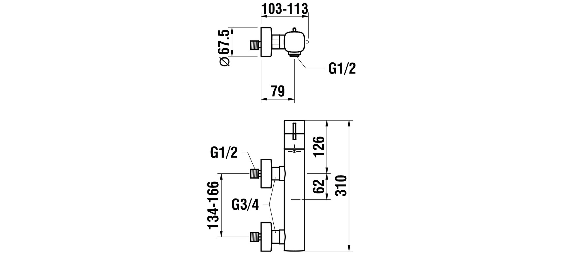 Sicherheitstaste (38 °C), Anschlussmaß 134-166 mm, thermostatische Kartusche, ohne Wandhalterung und Brausestange, S-Anschluss DN 15, Durchfluss/Geräuschgruppe: 9,9 l/min (3 bar)/IA