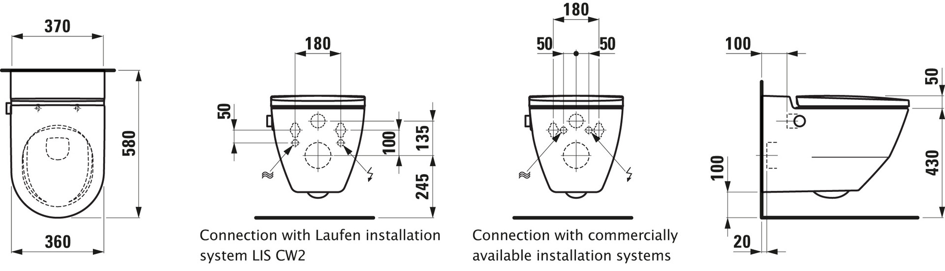 wandhängend, Duschfunktion (Durchfluss ca. 4,3 l/min, Powermodus ca. 5,6 l/min, Lady-Dusche ca. 2,5 l/min), für Netzbetrieb (220-240 V, 50-60 Hz), WC-Sitz mit Deckel abnehmbar, mit Absenkautomatik, mit Controller, mit Drehknopf für Duschfunktion, mit Fernbedienung mit Touch-Oberfläche, mit Wandbefestigungs-Set (SIA181, DIN 4109), Wandanschluss-Set für Dusch-WC, Wassereinlauf- und Wasserablaufmanschette DN 90, Funktionen: Gesäß-Dusche oder Lady-Dusche, einstellbar in Stärke, Position, Temperatur, Oszillier- und Pulsier-Funktion automatische Geruchsabsaugung mit Aktivkohlefilter, Orientierungslicht mit Signalfunktion, integrierte Entkalkungsfunktion, integrierte thermische Reinigung