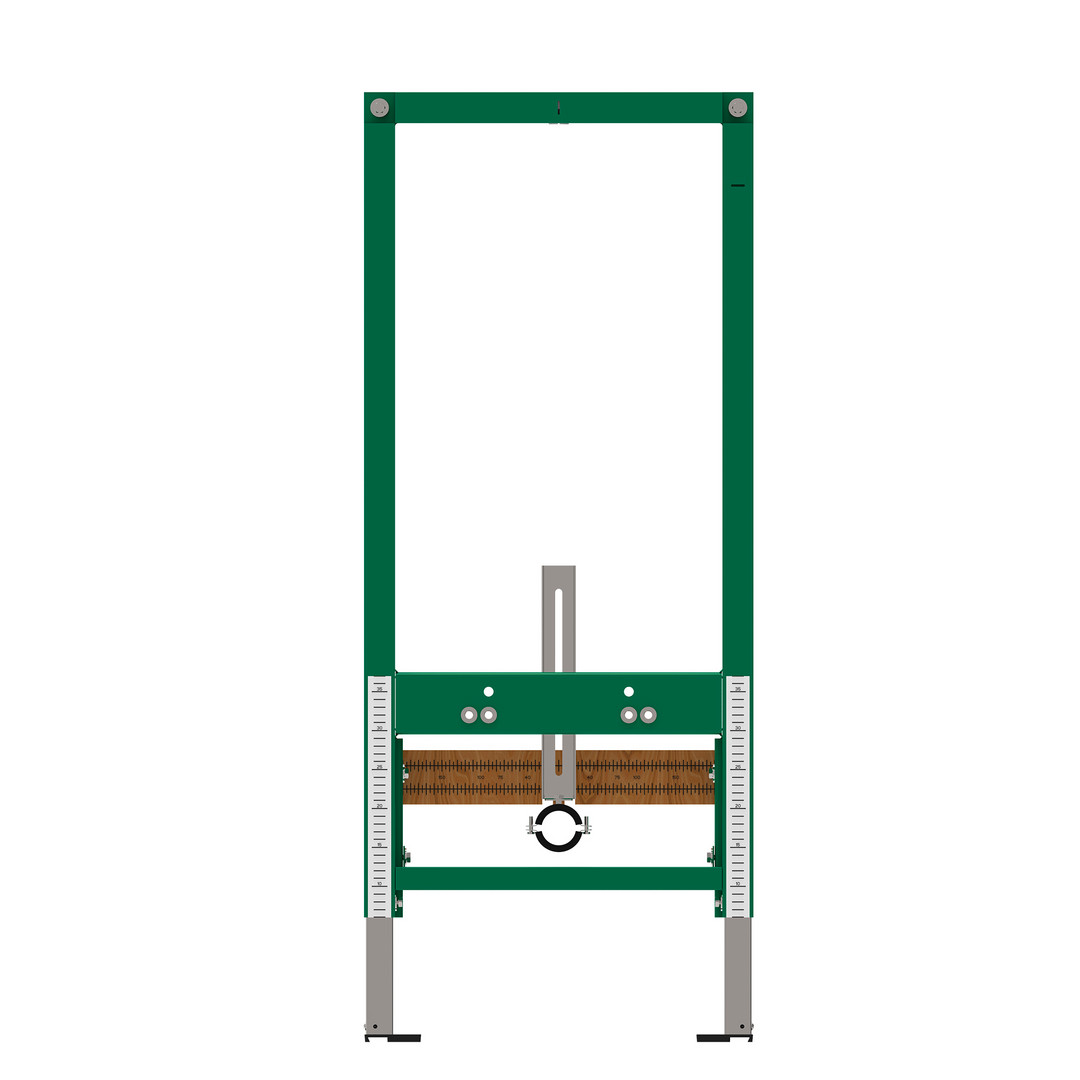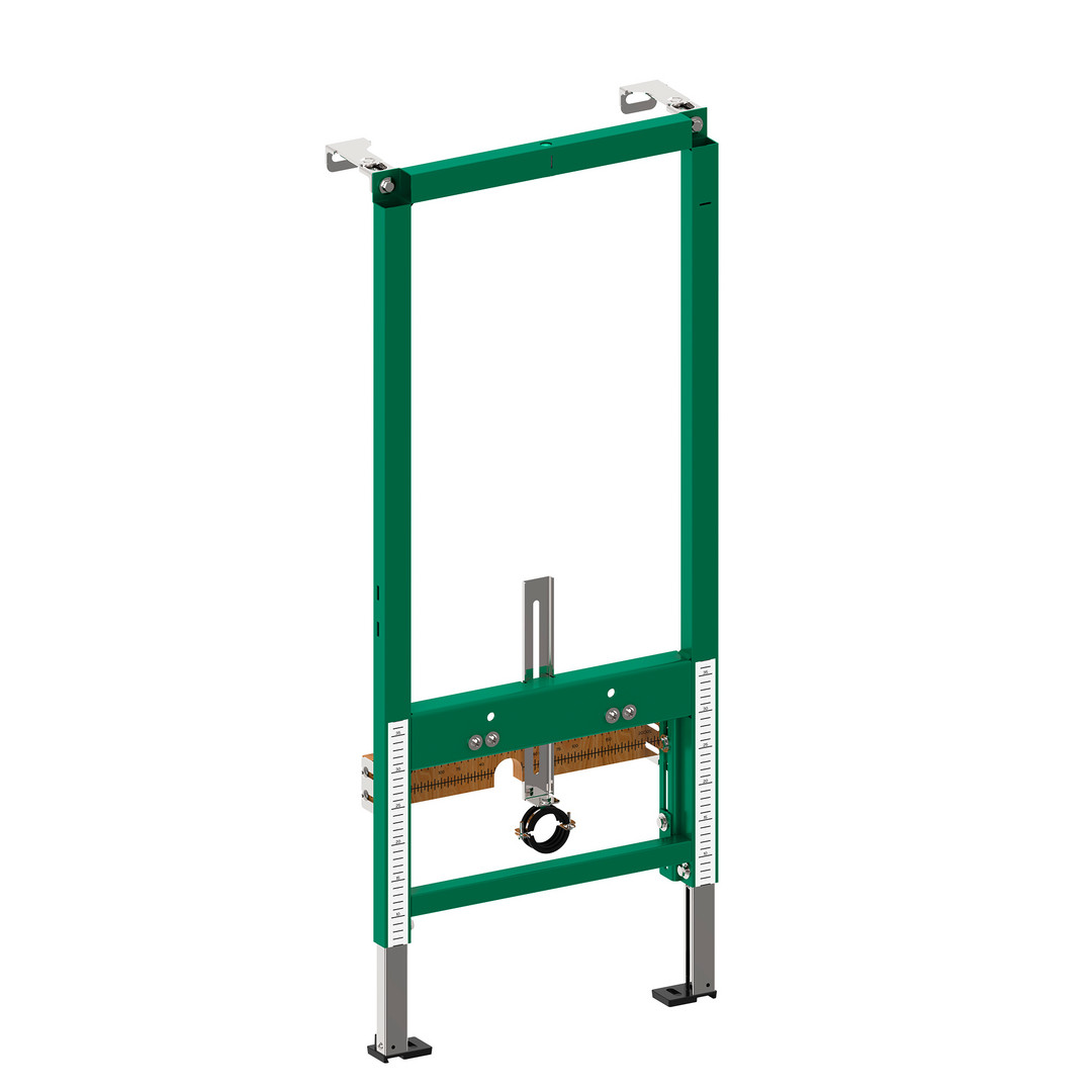 mit mehrfach verleimter Schichtholzplatte und Strichmaßskalierung zur freien Positionierung von Trinkwasserrohr-systemwandscheiben, selbstragender, pulverbeschichteter Stahlrahmen für Trocken- und Massivbau, für Vor- und Inwandinstallation Füße selbsthemmend, höhenverstellbar und drehbar, mit Wandhalter, verstellbar, mit Gewindestangen M12 und Befestigungsmaterial