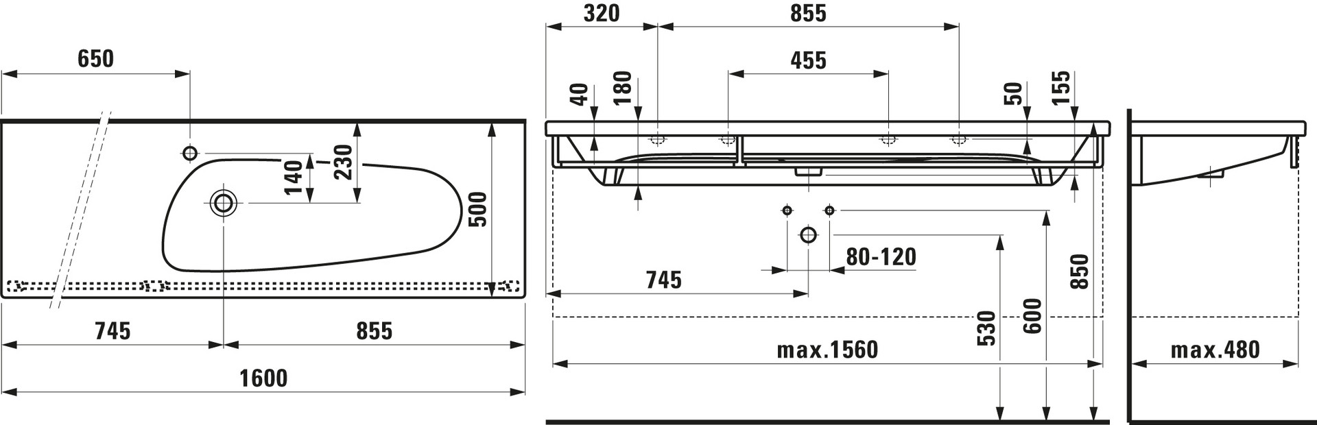 Laufen Waschtisch PALOMBA 160 x 50 cm, unterbaufähig, weiß LCC, mit Überlauf, ohne Hahnloch W53168